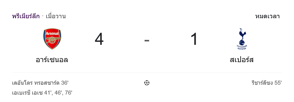 อาร์เซนอลได้ประตูจาก เลอันโดร ทรอสซาร์ด หนึ่งลูก และแฮตทริกโหด ๆ ของ เอเบเรชี เอเซ ขณะที่ทีมเยือนได้คืนจาก ริชาร์ลิซง ทำให้สกอร์บนหน้าจอและหน้าเว็บ บ้านผลบอล ตรึงอยู่ที่ 4-1 จนหมดเวลา พร้อมเสียงเฮกระหึ่มทั้งสนาม