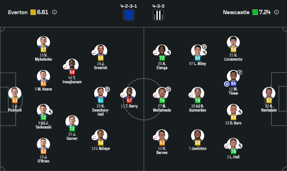 - จอร์แดน พิคฟอร์ด 6.3 – เซฟได้บ้างแต่รับศึกหนักจากการโจมตีของนิวคาสเซิ่ลตลอดเกม