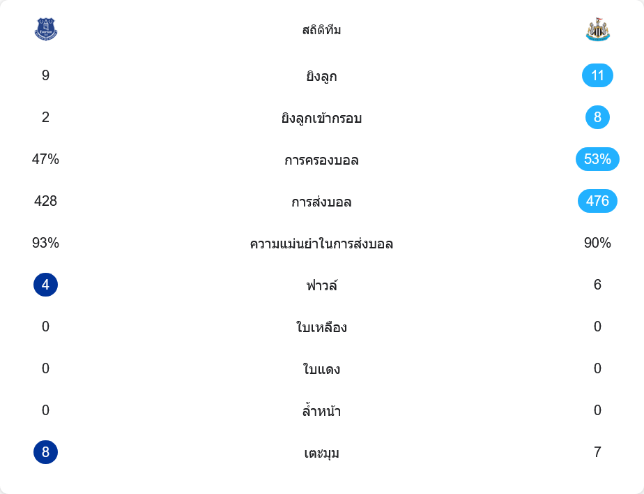 ตัวเลขออกมาสะท้อนรูปเกมชัดเจน นิวคาสเซิ่ลครองบอล 53% ต่อ 47% ของเอฟเวอร์ตัน ส่งบอลสำเร็จ 476 ครั้ง ความแม่นยำ 90% ส่วนเจ้าบ้านจ่ายสำเร็จ 428 ครั้ง แต่แม่นยำสูงถึง 93% แปลว่าทอฟฟี่เล่นบอลสั้นเซฟ ๆ ในแดนตัวเองเป็นหลัก ไม่ค่อยกล้าเสี่ยงจ่ายทะลุช่อง