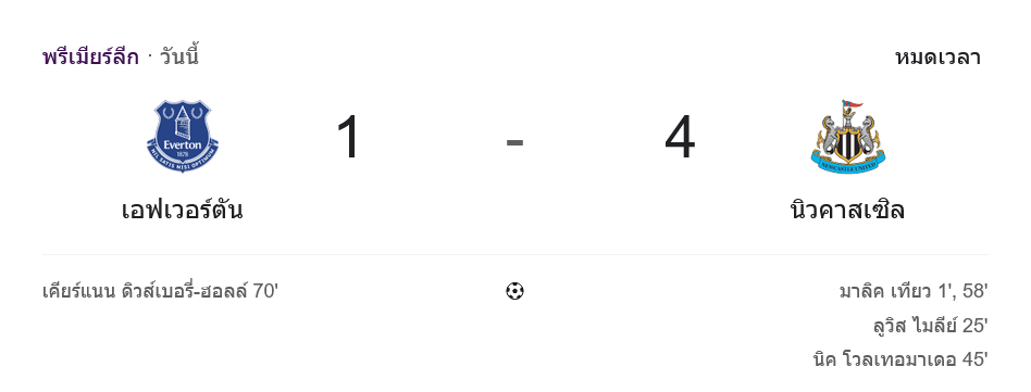 ครึ่งหลังเอฟเวอร์ตันพยายามแก้หมาก ส่งคาร์ลอส อัลการาซ ลงมาช่วยเกมรุก แต่กลายเป็นนิวคาสเซิ่ลที่หนี 0-4 จากลูกโขกของมาลิค เทียว กองหลังตัวแกร่งที่วันนี้ขึ้นไปทำประตูได้ด้วย ก่อนที่คีแรน ดิวส์บิวรี–ฮอลล์ จะซัดตีไข่แตกให้เจ้าถิ่นในนาที 69 จบเกม นิวคาสเซิ่ลบุกชนะ 1-4 พร้อมขโมยทุกแต้มกลับเซนต์ เจมส์ พาร์ก