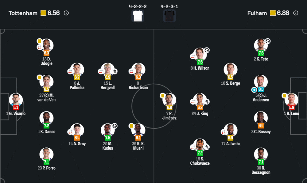 จุดชนะของฟูแล่มคือการอ่านจังหวะกองหลังสเปอร์สที่ถอยไม่พร้อมกัน การประสานงานระหว่าง เตเต้ เติมซ้อนในช่องครึ่งพื้นที่ (half-space) และวิลสันที่สอดเข้ากลาง สร้างความสับสนจนสเปอร์สเสียประตูอย่างรวดเร็ว อีกทั้งอันเดอร์เซนยืนอ่านเกมหน้ากรอบเขตโทษได้ยอดเยี่ยม เคลียร์ลูกครอสและบล็อกจังหวะยิงสำคัญหลายครั้ง