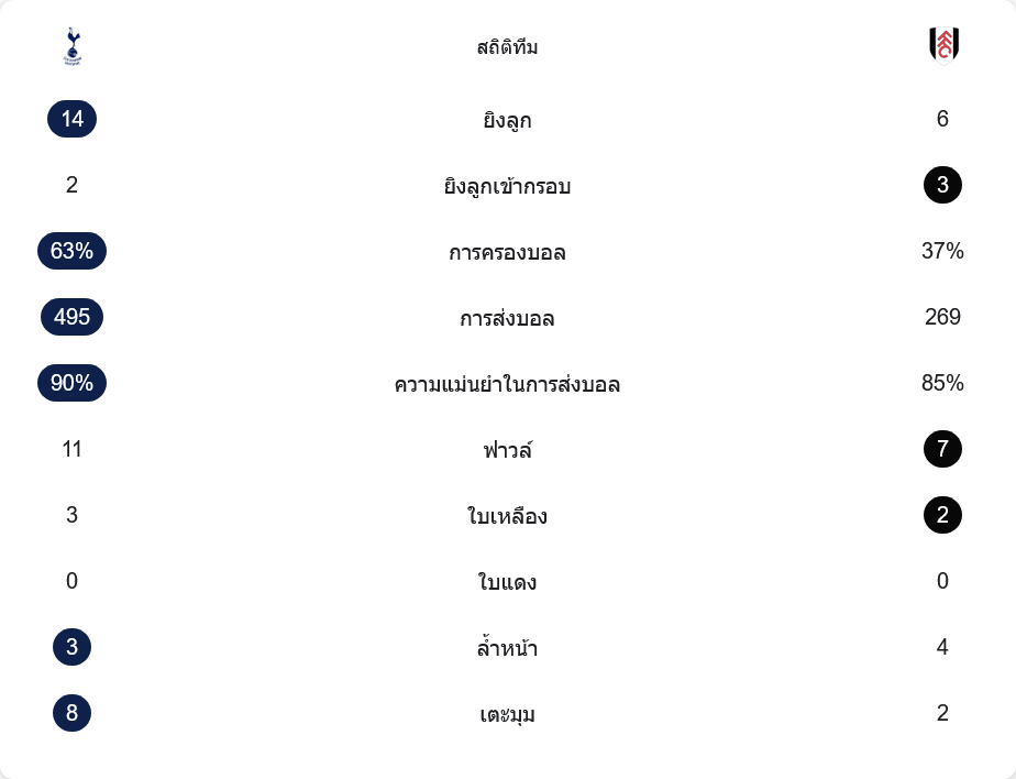 ตัวเลขหลังเกมชัดเจนว่านี่คือเกมที่สเปอร์ส “ครองบอลแต่ไม่คม” เจ้าบ้านยิงทั้งหมด 14 ครั้ง เข้ากรอบเพียง 2 ครั้ง ขณะที่ฟูแล่มยิงแค่ 6 แต่เข้ากรอบ 3 และเปลี่ยนเป็น 2 ประตูเต็มๆ การครองบอลสเปอร์สสูงถึง 63% เทียบกับ 37% ของฟูแล่ม การส่งบอลก็เหนือกว่ามาก 495 ต่อ 269 และความแม่นยำ 90% ต่อ 85%