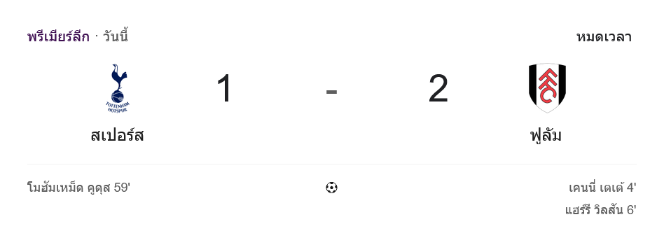 จาก : ผลบอลสด พรีเมียร์ลีก ระหว่าง ท็อตแน่ม ฮ็อทสเปอร์ 1-2 ฟูแล่ม วันนี้ 30/11/68 – บ้านกีฬา