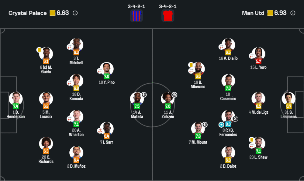 ด้านเกมรับ ยูไนเต็ดแม้เสียจุดโทษ แต่โดยรวมจัดระเบียบได้ดี หลังจากส่งมาซราอุยลงมา ทีมมีสมดุลมากขึ้น ทั้งการปิดพื้นที่ด้านข้างและการดันขึ้นล้ำหน้า ส่วนมาร์ติเนซที่ถูกส่งลงช่วงท้ายช่วยอ่านจังหวะครอสและลูกโด่ง ทำให้พาเลซแทบไม่มีโอกาสยิงเน้น ๆ ในสิบกว่านาทีสุดท้าย