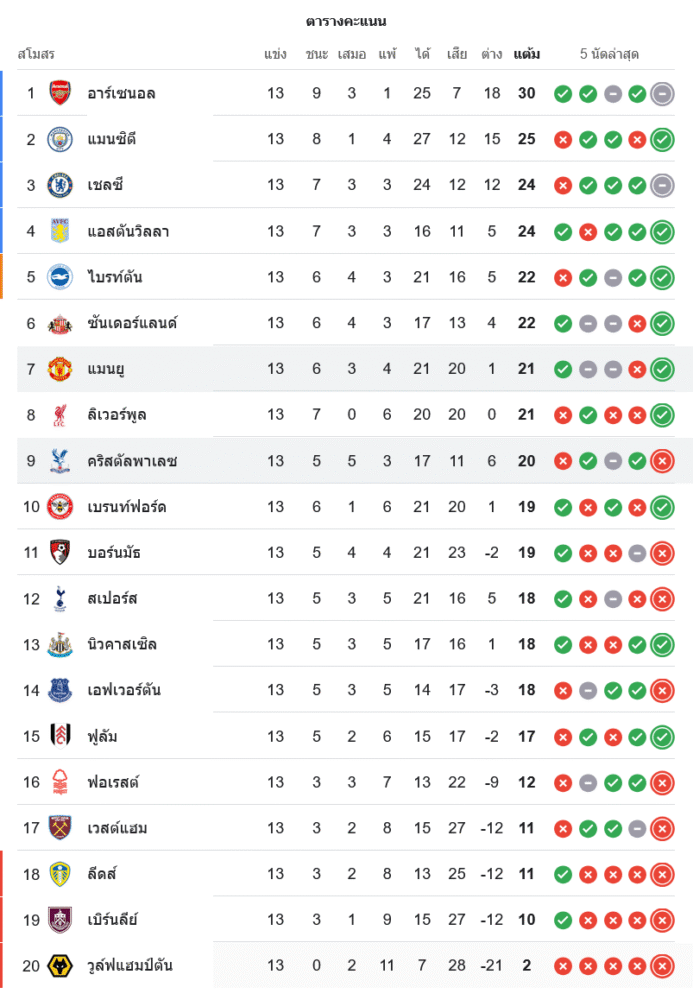 ส่วน คริสตัล พาเลซ แม้พ่ายคาบ้านแต่ยังยึดอันดับ 9 มี 20 คะแนนจาก 13 นัด รูปเกมโดยรวมไม่ได้แย่ เพียงขาดความเฉียบคมในจังหวะสำคัญ หากแก้ปัญหาจังหวะสุดท้ายและจัดการเกมรับช่วงโดนบุกหนักได้ดีขึ้น พาเลซยังมีโอกาสไต่อันดับขึ้นไปเบียดหัวตารางได้อีก
