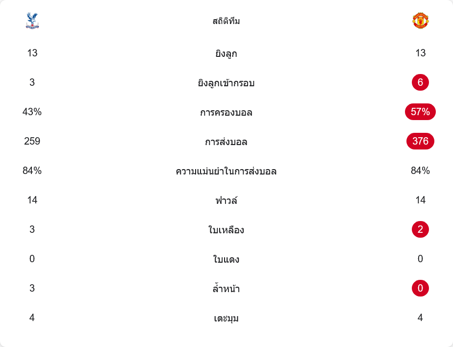 ตัวเลขหลังเกมสะท้อนภาพชัดเจน ทั้งสองทีมยิงเท่ากันทีมละ 13 ครั้ง แต่ แมนฯ ยูไนเต็ด ยิงเข้ากรอบมากกว่า 6 ต่อ 3 ซึ่งคือความแตกต่างเรื่องคุณภาพโอกาส พาเลซถือบอลได้ 43% เล่นในแบบถนัดคือรอจังหวะสวน ขณะที่ปีศาจแดงครองบอล 57% ต่อบอลสำเร็จ 376 ครั้งเหนือกว่าพาเลซที่ 259 ครั้ง ความแม่นยำในการจ่ายอยู่ที่ 84% เท่ากัน แปลว่าเรื่องเทคนิคพื้นฐานสูสี แต่ยูไนเต็ดเลือกจังหวะจบสกอร์ได้อันตรายกว่า