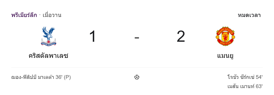 ท้ายเกม พาเลซเทหมดหน้าตัก แต่ยังเจาะแนวรับที่มีเดอ ลิกต์–มาร์ติเนซคุมอยู่ไม่เข้า แถม เจฟเฟอร์สัน เลอร์ม่า ที่ถูกส่งลงมาช่วงท้ายยังโดนใบเหลืองช่วงทดเจ็บนาที 90+3 จบเกม “ปีศาจแดง” รักษาสกอร์ แบกชัย 2-1 กลับบ้านแบบหืดจับ แต่คุ้มค่ากับสามคะแนนเต็ม