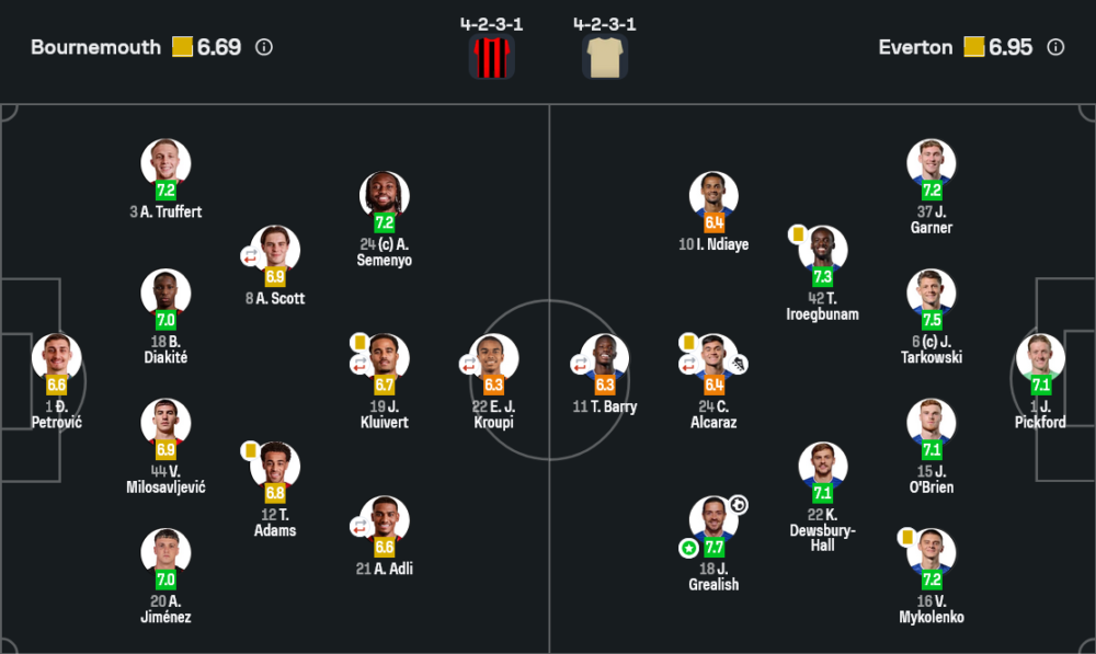 🔴 บอร์นมัธ (4-2-3-1) – เรตติ้งเฉลี่ย 6.69