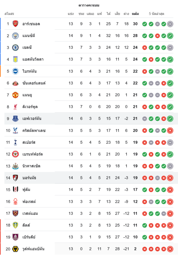 ส่วน บอร์นมัธ หลังแพ้คาบ้านยังคงมี 19 แต้มจาก 14 นัด รั้งอันดับ 14 ลูกได้เสีย -3 (ยิง 21 เสีย 24) แม้ยังไม่จ่อโซนตกชั้น แต่ถ้ายังปล่อยให้เกมในบ้านหลุดมือบ่อยๆ ความกดดันอาจเพิ่มขึ้นเรื่อยๆ โดยเฉพาะเมื่อทีมในโซนท้ายตารางเริ่มเก็บคะแนนได้