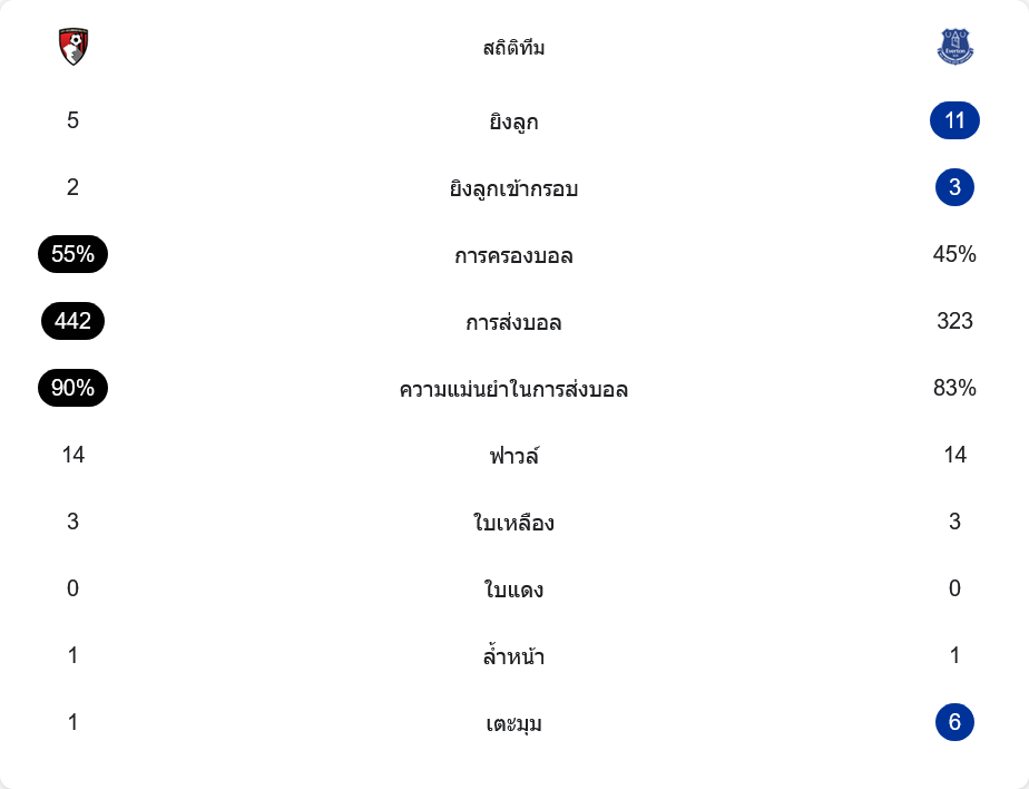 ตัวเลขหลังจบเกมบอกชัดว่า บอร์นมัธถือบอลเหนือกว่า 55% ต่อ 45% ต่อบอลสำเร็จมากกว่า (ราว 470 ต่อ 371 ครั้ง) และความแม่นยำในการผ่านบอลใกล้เคียงกัน แต่เอฟเวอร์ตันสร้างความอันตรายได้มากกว่าในพื้นที่สุดท้าย ด้วยจำนวนโอกาสยิงทั้งหมด 13 ครั้ง เข้ากรอบ 3 หน ขณะที่เจ้าถิ่นยิงเพียง 5 ครั้ง เข้ากรอบ 2