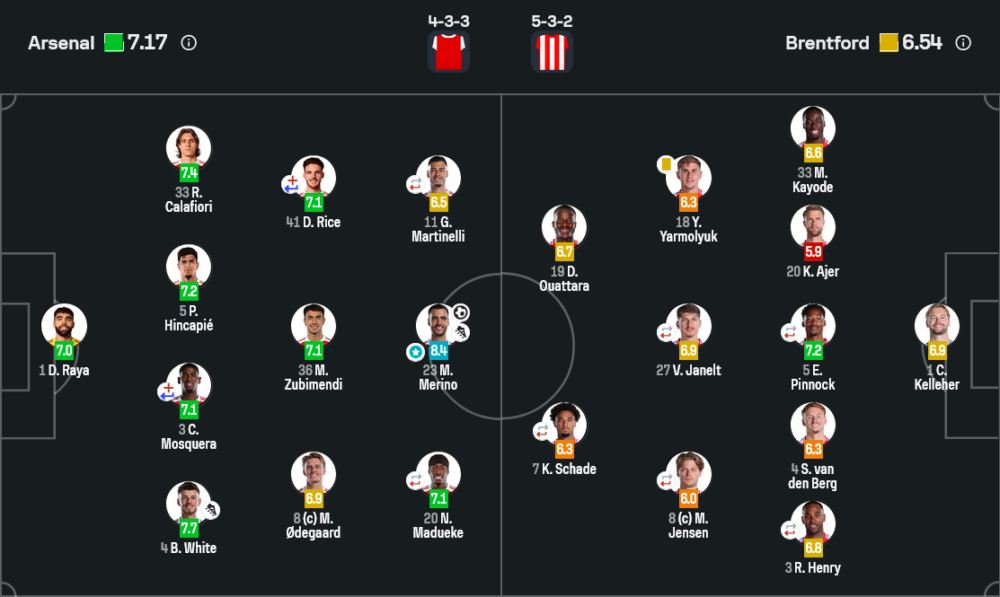 • มาร์ติน โอเดการ์ด (กัปตันทีม, 6.9) – ช่วยเซ็ตเกมและไล่บีบเพรสซิ่ง แม้ไม่ได้โดดเด่นเรื่องจบสกอร์
