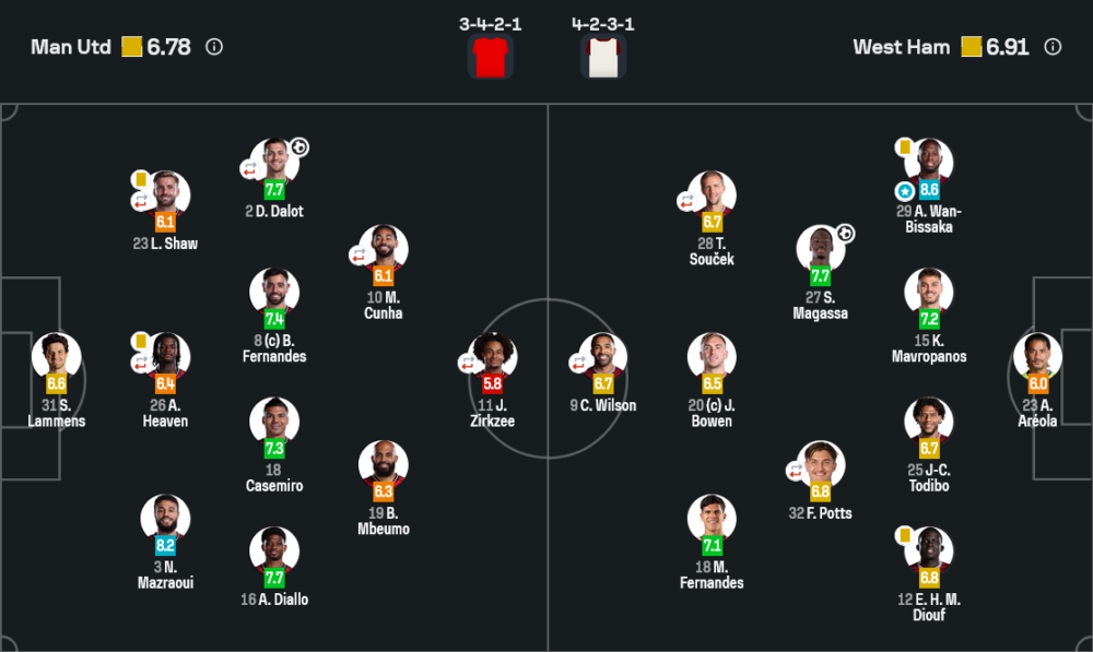 แม้ทีมจะเป็นฝ่ายบุกมาเยือน แต่ อารอน วาน-บิสซาก้า ฟูลแบ็กขวาเวสต์แฮมได้รับเลือกเป็น Player of the Match ด้วยคะแนนสูงถึง 8.6 เขาปิดเกมริมเส้นของแมนยูได้แทบสนิท ชนะดวล 1 ต่อ 1 หลายครั้ง รวมถึงตัดบอลสำคัญในกรอบเขตโทษหลายจังหวะ