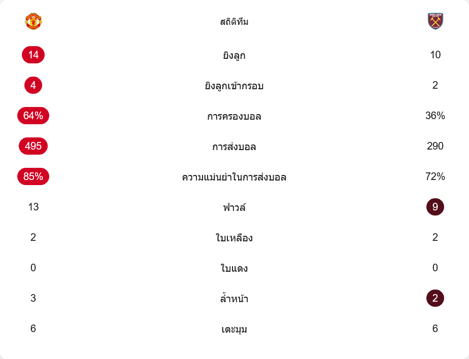 ตัวเลขหลังเกมบอกชัด แมนยูครองบอลเหนือกว่าอย่างชัดเจนด้วยอัตราครองบอลราว 64% ต่อ 36% ผ่านบอลกว่า 495 ครั้ง ความแม่นยำ 85% ขณะที่เวสต์แฮมผ่านบอลเพียงประมาณ 290 ครั้ง แต่เน้นบอลตรงเข้าเป้าและสวนกลับเร็วมากกว่า
