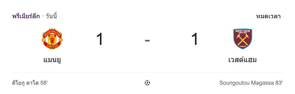 ท้ายเกม แมนยูส่ง ลิซานโดร มาร์ติเนซ ลงมาช่วยเร่งเปิดเกม แต่เวสต์แฮมถอยทั้งแผง ครองพื้นที่แนวรับแบบไม่เปิดช่องให้เจ้าบ้านได้จบแบบจะแจ้งอีก จบ 90 นาทีรวมทดเวลา แมนฯ ยูไนเต็ด เสมอ เวสต์แฮม ยูไนเต็ด 1-1 แบบทำแต้มหลุดมือในบ้านตัวเองไปอย่างน่าเสียดาย
