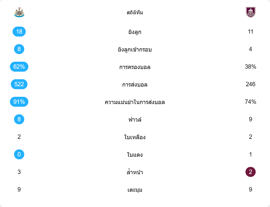 ตัวเลขหลังเกมสะท้อนชัดว่า นิวคาสเซิ่ล เหนือกว่าแทบทุกมิติ เจ้าถิ่นยิงทั้งสิ้น 18 ครั้ง เข้ากรอบ 8 ครั้ง ขณะที่เบิร์นลี่ย์ยิง 11 ครั้ง เข้ากรอบแค่ 4 นอกจากนี้ “สาลิกาดง” ยังครองบอลถึง 62% ต่อ 38% จ่ายบอลมากถึง 522 ครั้ง และที่น่าประทับใจคือความแม่นยำในการจ่ายสูงถึง 91% แปลว่าทีมของฮาวคอนโทรลเกมด้วยบอลสั้นได้อย่างเหนียวแน่น ส่วนเบิร์นลี่ย์จ่ายบอลเพียง 246 ครั้ง ความแม่นยำ 74% ต้องวิ่งไล่บอลมากกว่าครองบอลเอง ฟาวล์ใกล้เคียงกันที่ 8 ต่อ 9 ใบเหลืองทีมละ 2 แต่ใบแดงของ ปิเรส คือหมัดน็อกสำคัญ ขณะที่ลูกตั้งเตะอย่างเตะมุมแบ่งกันทีมละ 9 ครั้ง แสดงให้เห็นว่าเกมนี้เปิดหน้าแลกกันตลอด แม้รูปเกมจะเทไปทางเจ้าบ้านก็ตาม