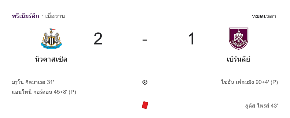 ศึก พรีเมียร์ลีก ที่เซนต์ เจมส์ พาร์ค เกมนี้แฟนบอลที่เช็กสกอร์ผ่าน ผลบอลสด และหน้าจอ บ้านผลบอล ได้ลุ้นกันจนวินาทีสุดท้าย เมื่อ นิวคาสเซิ่ล ยูไนเต็ด ของ เอ็ดดี้ ฮาว เปิดบ้านรับการมาเยือนของ เบิร์นลี่ย์ ทีมหนีตายที่ต้องการแต้มทุกเม็ด แต่จบ 90 นาที กลายเป็น “สาลิกาดง” ที่คมกว่าเฉือนชนะ 2-1 จากจุดโทษของ แอนโธนี่ กอร์ดอน และลูกยิงเปิดหัวของ บรูโน่ กิมาไรส์ ส่วนทีมเยือนตีไข่แตกช่วงทดเจ็บจากจุดโทษของ เซียน เฟลมมิงก์ ทั้งที่เหลือ 10 คนตั้งแต่นาที 43