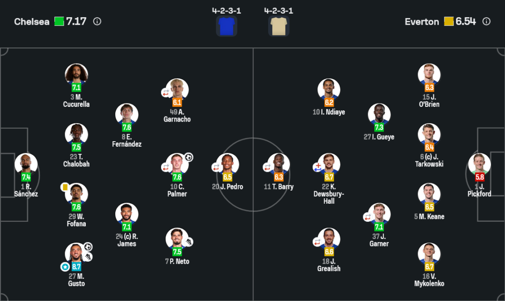 ฝั่งเอฟเวอร์ตันพยายามตั้งรับในทรง 4-4-1-1 โดยให้เกย์และการ์เนอร์ยืนคู่กลางคอยดักบอล แต่เมื่อถูกดันให้ถอยลึกเกินไป เกมสวนกลับก็ขาดตัวเชื่อม บอลมักไปตายที่ริมเส้นหรือหน้าเขตโทษเชลซีเพราะไม่มีตัวทำลายไลน์คู่เซ็นเตอร์อย่างต่อเนื่อง แม้เกย์กับการ์เนอร์จะพอประคองแดนกลางได้ แต่เมื่อทีมต้องเปิดหน้าแลก ก็ถูกช่องว่างด้านหลังเล่นงานอยู่หลายครั้ง