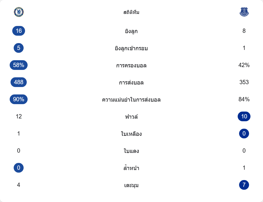 ตัวเลขหลังเกมยืนยันรูปเกมในสนามแบบไม่ต้องเถียง เชลซียิงทั้งหมด 16 ครั้ง เข้ากรอบ 5 ครั้ง ขณะที่เอฟเวอร์ตันมีโอกาสส่องเพียง 8 ครั้ง เข้ากรอบแค่จังหวะเดียว เจ้าถิ่นครองบอล 58% ต่อ 42% แสดงให้เห็นถึงการคอนโทรลจังหวะและความมั่นใจในการต่อบอลจากหลังขึ้นหน้าอย่างเป็นระบบ