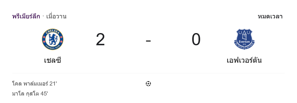 ท้ายเกมสกอร์ไม่มีเพิ่ม แต่เจ้าถิ่นยังคุมจังหวะได้อยู่หมัด ปล่อยให้เอฟเวอร์ตันได้ลุ้นแค่บางจังหวะจากลูกตั้งเตะและการยิงไกล จบ 90 นาที เชลซีเก็บสามแต้มสำคัญด้วยชัยชนะ 2-0 แบบไร้ข้อกังขา สกอร์ตามหน้าเว็บสไตล์ บ้านผลบอล ชัดเจนว่าทอฟฟี่สีน้ำเงินกลับบ้านมือเปล่า