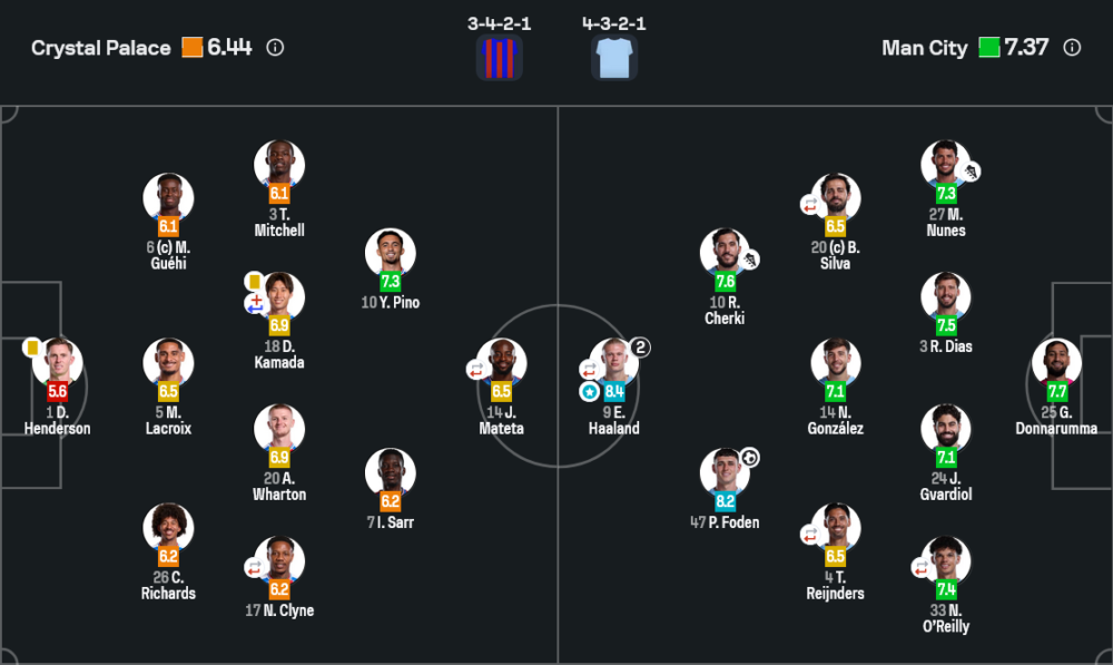 ฝั่งซิตี้จัด 4-3-2-1 ที่ยืดหยุ่นมาก แบร์นาร์โดถอยต่ำมาช่วยนิคมแดนกลางกับกอนซาเลซ ทำให้ทีมเยือนครองบอลถึง 63% เมื่อเสียบอลก็ใช้การเพรสซิ่งทันที กดพาเลซให้เล่นเกมโต้กลับยากขึ้นเรื่อยๆ การเคลื่อนที่ของฮาแลนด์ดึงตัวประกบ เปิดทางให้โฟเดนและแชร์กีทะลุช่อง โดยเฉพาะลูกแรกที่นูเนสเติมโอเวอร์แลปแล้วครอสให้ฮาแลนด์โหม่ง เป็นตัวอย่างการเจาะแผงหลังสามคนแบบ教科書เลยก็ว่าได้