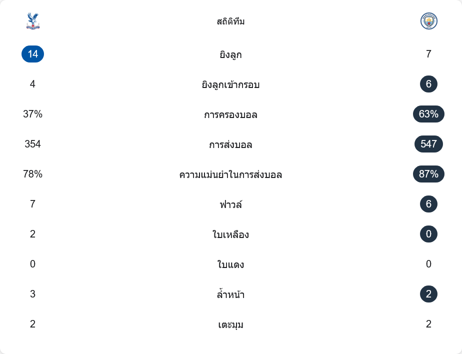 ตัวเลขหลังเกมชัดเจนว่าซิตี้คุมทุกอย่างในสนาม แม้พาเลซจะยิงรวม 14 ครั้ง มากกว่าซิตี้ที่ 7 ครั้ง แต่ความคมต่างกันชัดเจน เจ้าบ้านยิงเข้ากรอบเพียง 4 ขณะที่เรือใบซัดเข้ากรอบถึง 6 จาก 7 โอกาส การครองบอลอยู่ที่ 63% ต่อ 37% ตามด้วยจำนวนการส่งบอล 547 ต่อ 354 และความแม่นยำ 87% ต่อ 78% ซึ่งยืนยันว่าซิตี้เล่นบอลบนพื้นได้ไหลลื่นกว่า