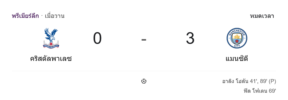 ศึก พรีเมียร์ลีก คู่ดึกที่เซลเฮิร์สต์ ปาร์ก แฟนบอลเปิดหน้าเช็กสกอร์แบบ ผลบอลสด กันหายใจไม่ทั่วท้อง ก่อนจบลงด้วยชัยชนะสุดนิ่งของ แมนเชสเตอร์ ซิตี้ ที่บุกมาถล่มเจ้าถิ่น คริสตัล พาเลซ ขาดลอย 3-0 จากสองประตูของเออร์ลิง ฮาแลนด์ และลูกปิดบัญชีของฟิล โฟเดน ทำให้เรือใบสีฟ้ายึดรองจ่าฝูงต่อ พร้อมกดดันจ่าฝูงแบบหายใจรดต้นคอ