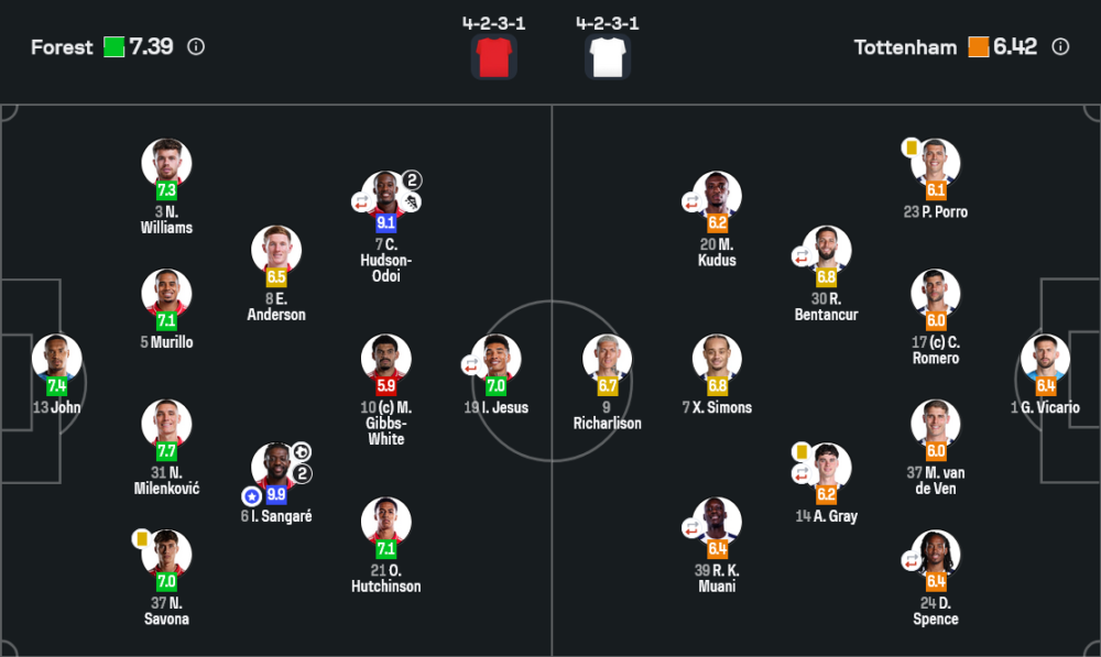 ค่ำคืนนี้ต้องยกให้ อิบราฮิม ซ็องกาเร่ แบบไม่มีข้อโต้แย้ง มิดฟิลด์ตัวรับฟอเรสต์คว้าเรตติ้งสูงสุด 9.9 จากการเป็นคนกำหนดจังหวะเกมทั้งหมด เขาเป็นคนตัดบอลเปิดเกมสวนกลับจนเกิดสองประตูแรกของ ฮัดสัน-โอดอย ก่อนจะวิ่งสอดขึ้นมายิงเองลูกที่สาม