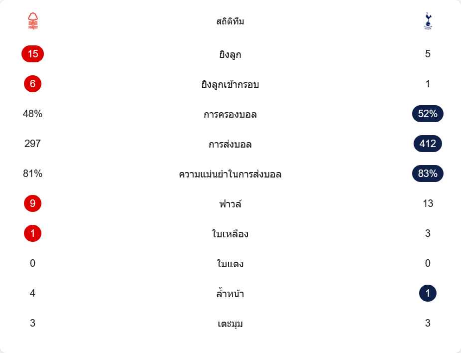 ตัวเลขหลังเกมสะท้อนรูปเกมชัดเจน ฟอเรสต์ยิงไปถึง 15 ครั้ง เข้ากรอบ 6 ครั้ง เปลี่ยนเป็น 3 ประตูเต็มๆ ขณะที่สเปอร์สมีโอกาสยิงแค่ 5 ครั้ง เข้ากรอบเพียงลูกเดียว แม้ทีมเยือนจะครองบอลได้ 52% ต่อ 48% และจ่ายบอลมากกว่า 412 ต่อ 297 ครั้งด้วยความแม่นยำ 83% ต่อ 81% แต่ส่วนใหญ่เป็นการต่อบอลไป-มาในแดนตัวเอง ไม่สามารถเจาะโซนท้ายของฟอเรสต์ได้ ฟาวล์ของสเปอร์สสูงถึง 13 ครั้งและโดนใบเหลือง 3 ใบ บ่งบอกถึงการเล่นที่ผิดจังหวะและตามหลังคู่แข่งอยู่ตลอด ขณะที่ฟอเรสต์ฟาวล์ 9 ครั้ง มีใบเหลืองเดียว ล้ำหน้าถึง 4 ครั้งแสดงให้เห็นว่าเล่นเกมรุกแบบไลน์สูงกล้าสวนกลับเต็มตัว ส่วนเตะมุมแบ่งกันคนละ 3 หน