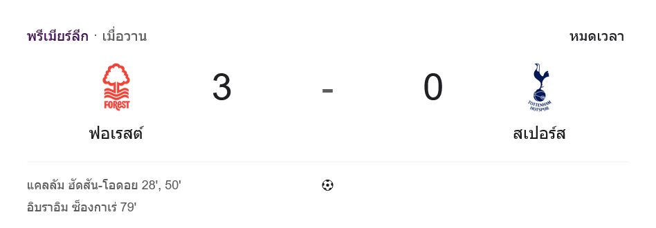 - 🔔 ทดเวลา 5 นาที สเปอร์สพยายามบุกแต่ไม่สามารถเจาะแนวรับฟอเรสต์ได้ จบเกมด้วยชัยชนะขาดลอย 3-0 ของเจ้าบ้าน