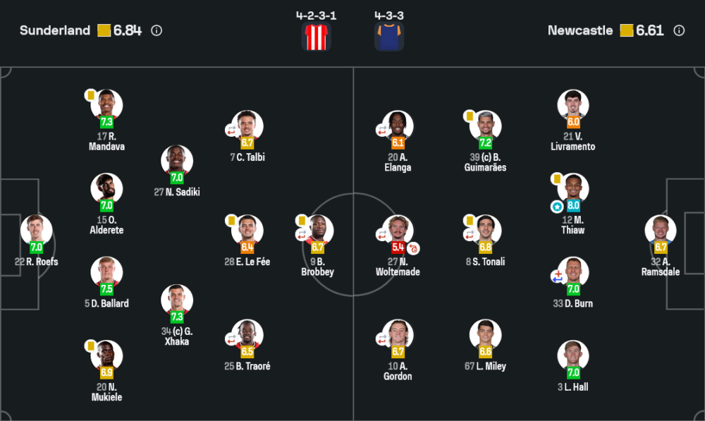 - 🟨 นาที 90+4 – ใบเหลืองจากการโต้เถียงสามคนรวด วิลสัน อีซิดอร์ (ซันเดอร์แลนด์), โจ วิลล็อก และ บรูโน่ กิมาไรส์ (นิวคาสเซิ่ล)