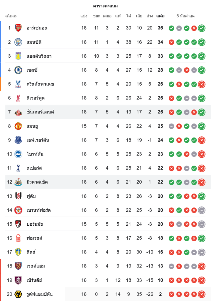 จากตารางคะแนนล่าสุด ซันเดอร์แลนด์ลงเล่น 16 นัด ชนะ 7 เสมอ 5 แพ้ 4 ยิงได้ 19 เสีย 17 ประตูได้เสีย +2 เก็บเพิ่มเป็น 26 คะแนน ขยับขึ้นมายึดอันดับ 7 ของพรีเมียร์ลีก ช่วงชิงพื้นที่ลุ้นถ้วยยุโรปกับกลุ่มทีมอย่าง ลิเวอร์พูล คริสตัล พาเลซ และทีมใหญ่กลุ่มหัวตารางอย่างเชือดเฉือน