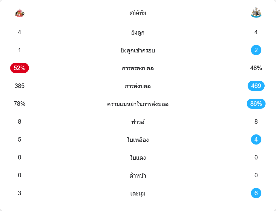 จำนวนฟาวล์เท่ากันที่ 8 ครั้งต่อฝั่ง แต่ซันเดอร์แลนด์โดนใบเหลืองมากกว่า 5 ใบ ขณะที่นิวคาสเซิ่ลโดน 4 ใบ แสดงให้เห็นถึงเกมรับที่ต้องเล่นหนักเพื่อปิดพื้นที่ โดยเฉพาะช่วงท้ายที่มีใบเหลืองจากการโต้เถียงรวดเดียวหลายคน ลูกเตะมุมเป็นของนิวคาสเซิ่ลมากกว่า 6 ต่อ 3 แต่ก็ยังไม่สามารถเจาะตาข่ายเจ้าบ้านได้