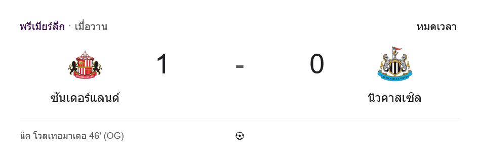 ศึกดาร์บี้แห่งแดนตะวันออกเฉียงเหนือในเวทีพรีเมียร์ลีกระหว่าง ซันเดอร์แลนด์ เปิดบ้านรับ นิวคาสเซิ่ล ยูไนเต็ด จบลงด้วยชัยชนะสำคัญของเจ้าถิ่น 1-0 จากลูกทำเข้าประตูตัวเองของ นิคลาส โวลท์เทอมาด์ ช่วงต้นครึ่งหลัง เกมนี้แฟนบอลที่กดเช็ก ผลบอลสด กันตลอด 90 นาทีได้ลุ้นกันแบบหายใจไม่ทั่วท้อง เพราะรูปเกมสูสี เข้าปะทะหนัก มีทั้งใบเหลืองถล่มท้ายเกม และจังหวะเดือดให้พูดถึงเพียบ ขณะที่ฝั่งรายงานจาก บ้านผลบอล ก็ยืนยันชัดว่าชัยชนะครั้งนี้ส่ง “แมวดำ” ขึ้นมายึดอันดับ 7 ของตารางแบบเต็มภาคภูมิ