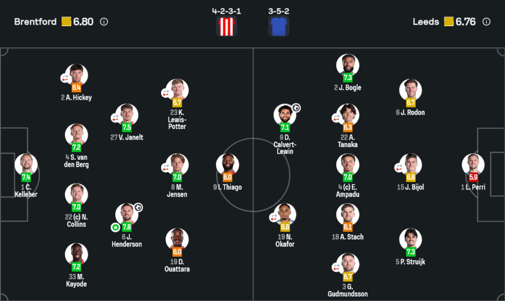 เกมนี้รูปแบบการยืนตำแหน่งชัดเจนว่าเบรนท์ฟอร์ดต้องการคุมเกมตั้งแต่แดนกลาง ระบบสี่-สอง-สาม-หนึ่งทำให้เฮนเดอร์สันกับยาเนลต์มีพื้นที่คุมโซนหน้ากรอบเขตโทษตัวเองและคอยดันบอลขึ้นหน้า พอบอลถึงเยนเซน เขาจะเป็นจุดหมุนเชื่อมไปสู่อูอัตตาราและลูอิส-พ็อตเตอร์ริมเส้น ซึ่งเป็นคอนเซ็ปต์สำคัญของการโจมตีเจ้าถิ่น การประสานงานระหว่างฟูลแบ็กกับปีกช่วยให้เบรนท์ฟอร์ดครอสบอลได้ต่อเนื่อง แม้ติอาโก้จะไม่เฉียบคม แต่แรงกดดันที่สร้างขึ้นทำให้แนวรับลีดส์แทบไม่ได้ดันสูงแบบที่เคยเห็น