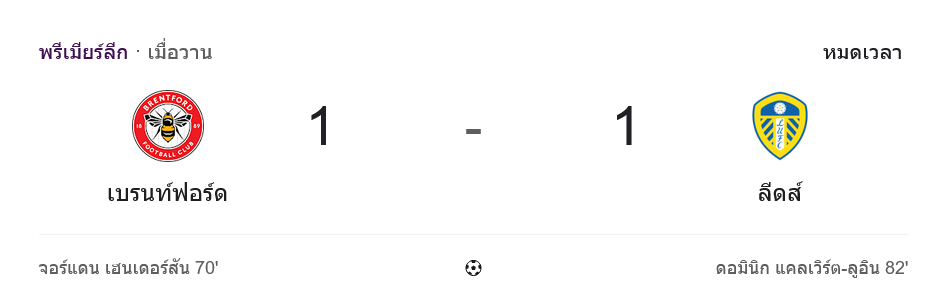 ศึกพรีเมียร์ลีกที่จีเทค คอมมูนิตี้ สเตเดียม จบลงแบบทำเอาแฟนบอลต้องเช็กสกอร์ผ่าน ผลบอลสด กันรัวๆ เมื่อเบรนท์ฟอร์ดของคีธ แอนดรูว์ส ออกนำก่อนจากลูกยิงไกลสุดแรงของจอร์แดน เฮนเดอร์สัน แต่ลีดส์ ยูไนเต็ด ของดาเนียล ฟาร์เค ไม่ยอมตายง่ายๆ ไล่ตีเสมอจากโดมินิค คัลเวิร์ต-ลูวิน ในช่วงท้ายเกม จบเกมแบ่งแต้มแบบเจ็บคนละแผล 1-1