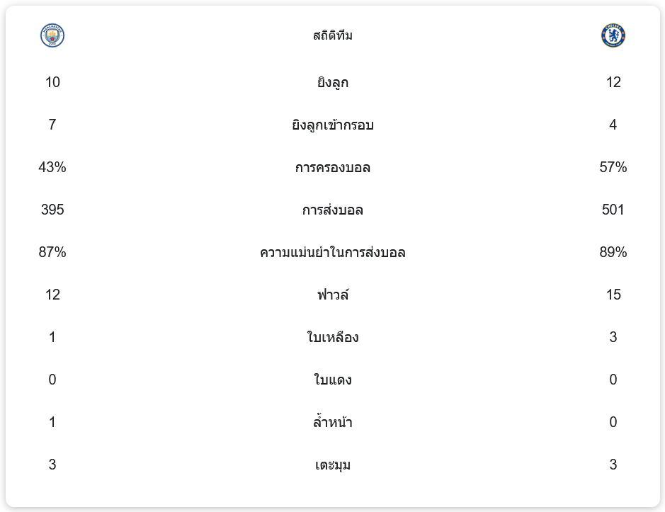 ทีมแมนเชสเตอร์ ซิตี้ มีการยิงทั้งหมด 10 ครั้ง โดยยิงเข้ากรอบ 7 ครั้ง พวกเขาครองบอลได้ 43% และมีการทำฟาวล์ 12 ครั้ง ได้รับใบเหลือง 1 ใบ ไม่มีใบแดง ได้เตะมุม 3 ครั้ง และล้ำหน้า 1 ครั้ง