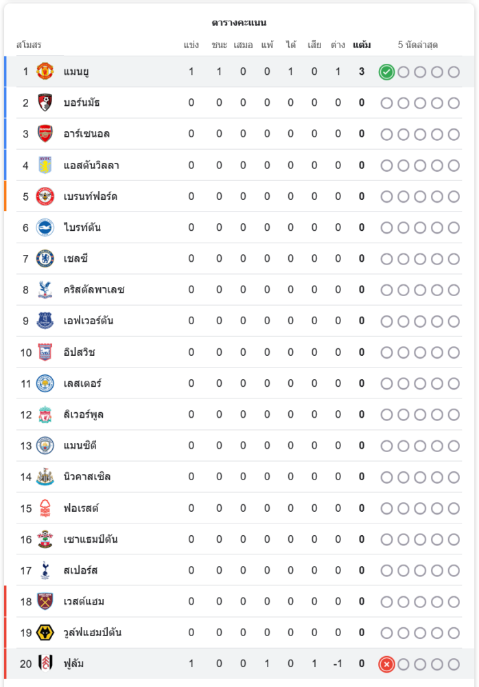 ตารางคะแนนพรีเมียร์ลีก 2024 จากชัยชนะในนัดนี้ แมนเชสเตอร์ ยูไนเต็ด ขึ้นเป็นจ่าฝูงของตารางคะแนน พรีเมียร์ลีก 2024 ด้วยการมี 3 คะแนนเต็มจากการลงเล่น 1 นัด ขณะที่ ฟูแล่ม อยู่ในอันดับที่ 20 ยังไม่มีคะแนน
