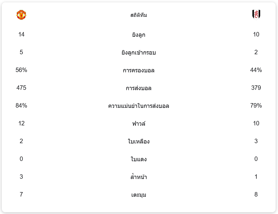 ด้าน ฟูแล่ม มีการยิงทั้งหมด 10 ครั้ง เข้ากรอบ 2 ครั้ง และครองบอลได้ 44% ด้วยการส่งบอลทั้งหมด 379 ครั้ง ความแม่นยำในการส่งบอลอยู่ที่ 79% พวกเขาทำฟาวล์ทั้งหมด 10 ครั้ง ได้รับใบเหลือง 3 ใบ และไม่มีใบแดง ได้เตะมุม 8 ครั้ง
