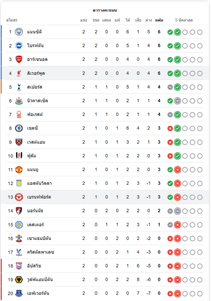 ตารางคะแนนพรีเมียร์ลีกล่าสุด