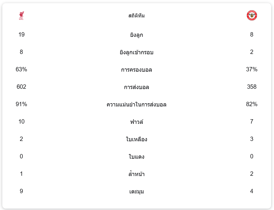 ลิเวอร์พูลครองบอลได้ถึง 63% และมีโอกาสยิงถึง 19 ครั้ง โดยเข้ากรอบ 8 ครั้ง ขณะที่เบรนท์ฟอร์ดมีโอกาสยิงเพียง 8 ครั้ง เข้ากรอบ 2 ครั้ง ความแม่นยำในการส่งบอลของลิเวอร์พูลสูงถึง 91% จากการส่งบอลทั้งหมด 602 ครั้ง ส่วนเบรนท์ฟอร์ดมีความแม่นยำในการส่งบอล 82% จากการส่งบอล 358 ครั้ง เกมนี้มีการทำฟาวล์เกิดขึ้นรวม 17 ครั้ง โดยลิเวอร์พูลทำฟาวล์ 10 ครั้ง ได้รับใบเหลือง 2 ใบ ขณะที่เบรนท์ฟอร์ดทำฟาวล์ 7 ครั้ง และได้รับใบเหลือง 3 ใบ