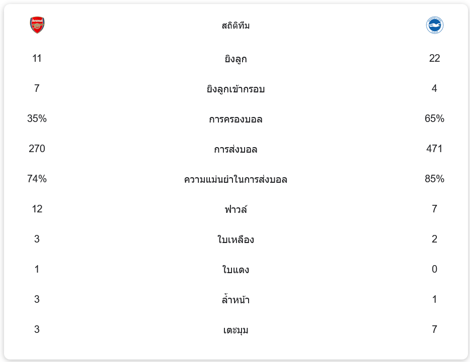 สถิติการแข่งขัน ระหว่างสองทีมนี้แสดงให้เห็นถึงความแตกต่างในการครองบอลและการสร้างโอกาส โดยไบรท์ตันสามารถครองบอลได้ถึง 65% และมีการส่งบอลมากถึง 471 ครั้ง ซึ่งเหนือกว่าอาร์เซนอลที่ครองบอลเพียง 35% และมีการส่งบอลเพียง 270 ครั้ง นอกจากนี้ ไบรท์ตันยังมีโอกาสยิงถึง 22 ครั้ง เทียบกับอาร์เซนอลที่ยิงได้เพียง 11 ครั้งเท่านั้น อย่างไรก็ตาม การยิงเข้ากรอบของไบรท์ตันมีเพียง 4 ครั้ง ทำให้อาร์เซนอลยังคงรักษาความได้เปรียบในช่วงแรกของเกม