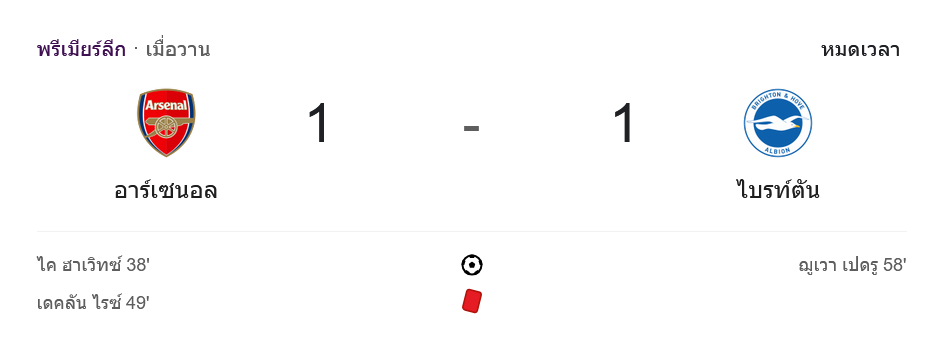 การแข่งขันฟุตบอลพรีเมียร์ลีก 2024 นัดล่าสุดระหว่าง อาร์เซนอล และ ไบรท์ตัน โฮฟ อัลเบี้ยน สิ้นสุดลงด้วยผลเสมอ 1-1 ที่สนามเอมิเรตส์ สเตเดียม โดยแมตช์นี้เต็มไปด้วยความดุเดือดและเข้มข้น ทั้งสองทีมต่างทำผลงานได้ดี แต่ยังไม่เพียงพอที่จะคว้าชัยชนะกลับบ้าน