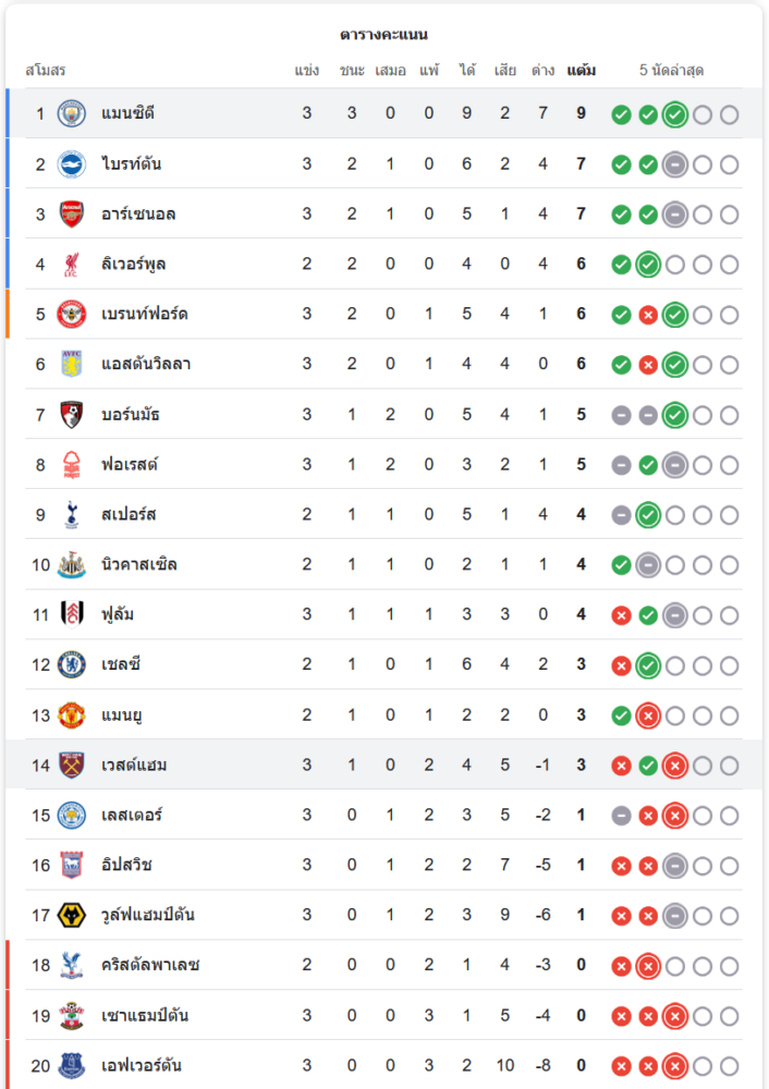 ตารางคะแนนเวสต์แฮมยูไนเต็ด 1-3 แมนเชสเตอร์ ซิตี้จากผลการแข่งขันในนัดนี้ แมนเชสเตอร์ ซิตี้ ยังคงรั้งอันดับที่ 1 ของตารางคะแนนพรีเมียร์ลีก มี 9 คะแนนจาก 3 นัด และยังคงรักษาสถิติไม่แพ้ใครไว้ได้ ขณะที่ เวสต์แฮมยูไนเต็ด ตกมาอยู่ในอันดับที่ 14 มีเพียง 3 คะแนนจาก 3 นัด ซึ่งยังต้องทำงานหนักเพื่อกลับมาแข่งขันในลีกให้ดีขึ้น