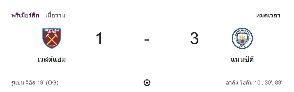 การแข่งขันฟุตบอลพรีเมียร์ลีก 2024 นัดนี้จบลงด้วยชัยชนะของ แมนเชสเตอร์ ซิตี้ ที่บุกมาเอาชนะ เวสต์แฮมยูไนเต็ด ไปได้ด้วยสกอร์ 3-1 ที่สนามลอนดอน สเตเดียม การแข่งขันเริ่มต้นขึ้นอย่างรวดเร็วและเข้มข้น โดยแมนเชสเตอร์ ซิตี้ สามารถขึ้นนำได้อย่างรวดเร็วในนาทีที่ 10 จากการยิงของ เออร์ลิง โฮลันด์ ที่ทำให้ทีมเยือนได้เปรียบตั้งแต่ต้นเกม