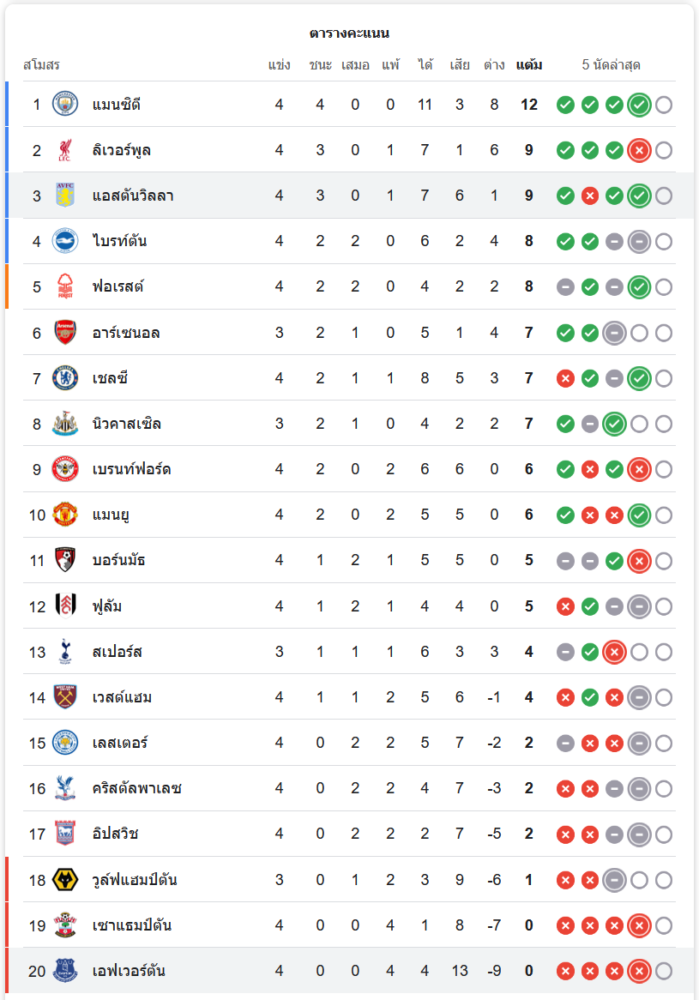 สถานการณ์ในตารางคะแนน: แอสตัน วิลล่าขยับขึ้นที่ 3 เอฟเวอร์ตันจมท้ายตาราง