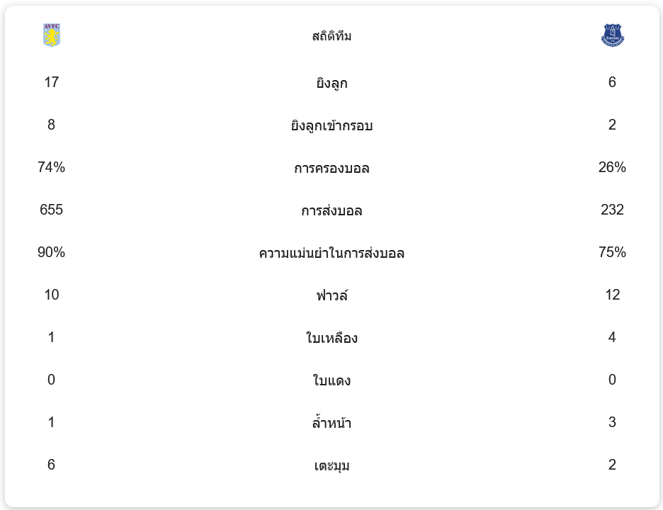 สถิติการแข่งขัน: แอสตัน วิลล่าเหนือกว่าชัดเจน
