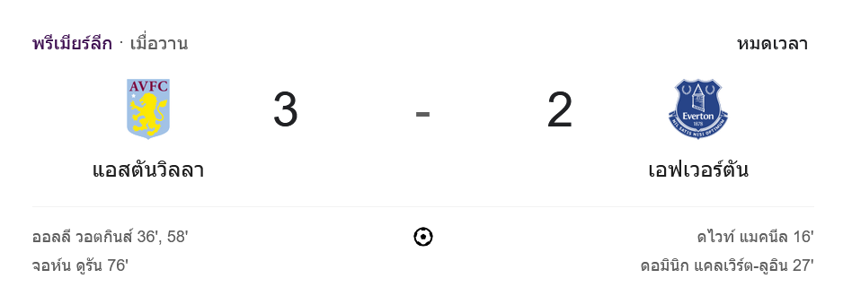 การแข่งขันฟุตบอล พรีเมียร์ลีก 2024 ระหว่าง แอสตัน วิลล่า พบกับ เอฟเวอร์ตัน จบลงด้วยชัยชนะของแอสตัน วิลล่า ด้วยสกอร์ 3-2 โดยเกมนี้เป็นไปอย่างเข้มข้นตั้งแต่ต้นจนจบ แอสตัน วิลล่า ต้องทำงานหนักในการกลับมาเอาชนะเอฟเวอร์ตันที่ขึ้นนำก่อนในช่วงครึ่งแรก แต่สุดท้ายพวกเขาสามารถเบียดเก็บ 3 แต้มไปได้อย่างสวยงาม