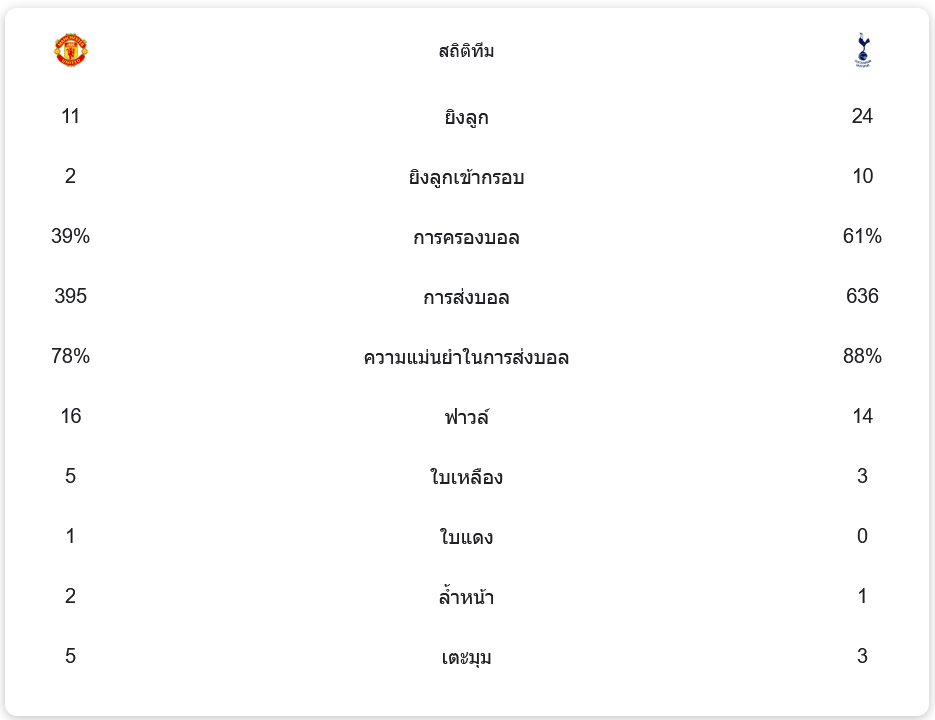 แม้ว่าแมนเชสเตอร์ ยูไนเต็ดจะมีโอกาสยิงเพียง 11 ครั้ง และเข้ากรอบเพียง 2 ครั้ง ขณะที่ท็อตแน่ม ฮ็อทสเปอร์ทำผลงานได้ยอดเยี่ยมด้วยการยิงทั้งหมด 24 ครั้ง และเข้ากรอบ 10 ครั้ง การครองบอลเป็นของท็อตแน่มที่เหนือกว่าด้วย 61% การจ่ายบอลของท็อตแน่มก็ดีกว่ามาก โดยมีความแม่นยำในการส่งบอลถึง 88% เมื่อเทียบกับแมนยูที่ทำได้เพียง 78%
