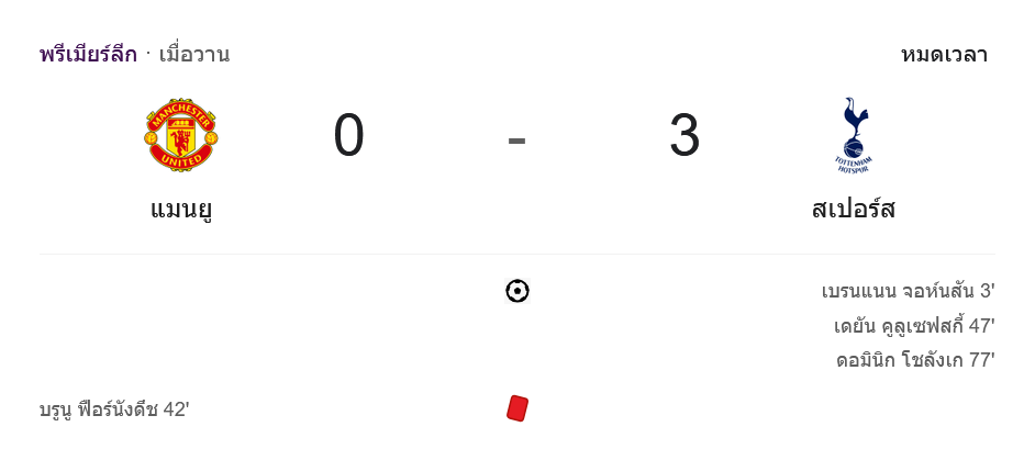 การแข่งขันฟุตบอล พรีเมียร์ลีก 2024 นัดที่โอลด์ แทรฟฟอร์ด แมนเชสเตอร์ ยูไนเต็ด ต้องพบกับ ท็อตแน่ม ฮ็อทสเปอร์ ในเกมที่เต็มไปด้วยความดุเดือดและโอกาส แต่ท้ายที่สุดเป็นทางด้านท็อตแน่ม ฮ็อทสเปอร์ที่บุกมาเอาชนะไปด้วยสกอร์ 3-0 โดยผู้เล่นแมนยูเสียใบแดงตั้งแต่ครึ่งแรก ทำให้สถานการณ์ยิ่งเลวร้ายขึ้นไปอีก