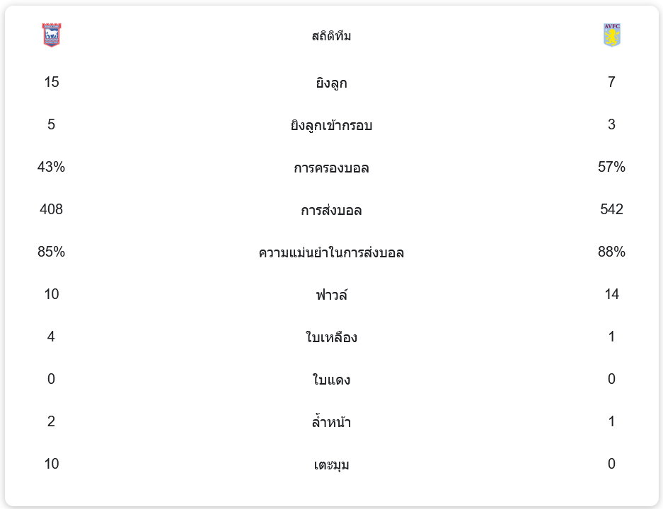 แอสตัน วิลล่ามีสถิติการครองบอลที่ดีกว่า โดยครองบอลไปถึง 57% เทียบกับอิปสวิชที่ทำได้ 43% การจ่ายบอลของวิลล่ามีความแม่นยำมากกว่าอยู่ที่ 88% ขณะที่อิปสวิชทำได้ 85% แม้ว่าผู้มาเยือนจะมีการครองบอลมากกว่า แต่โอกาสในการยิงกลับเป็นอิปสวิชที่ยิงมากถึง 15 ครั้ง เข้ากรอบ 5 ครั้ง ขณะที่แอสตัน วิลล่ายิงเพียง 7 ครั้ง เข้ากรอบ 3 ครั้ง